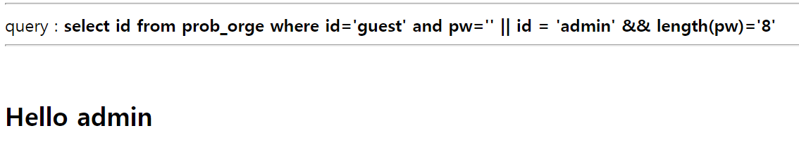 ' || id='admin' %26%26 length(pw)='8 : and 대신 &&을 쓸 수 있는데. URL에서 &는 필터링된다. 아스키코드로 %26%26썼더니 hello admin