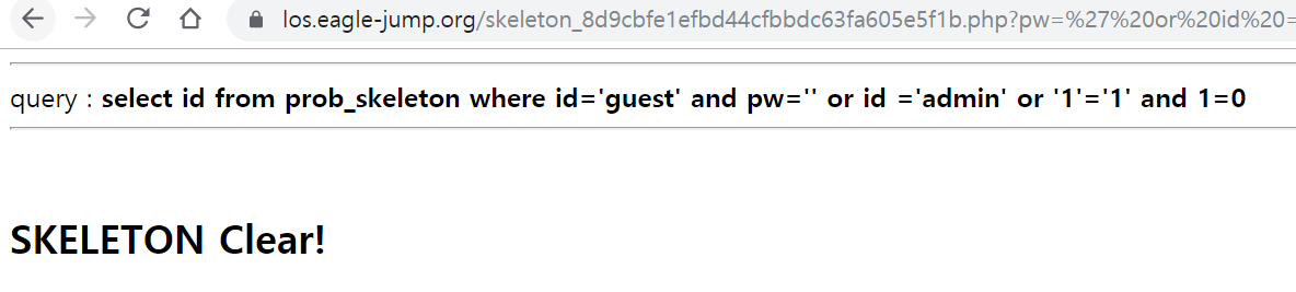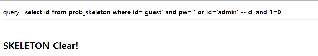 $query = "select id from prob_skeleton where id='guest' and pw='{$_GET[pw]}' and 1=0";