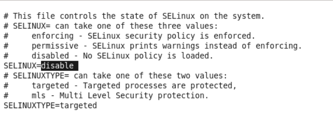 3. /etc/sysconfig/selinux에서 SELINUX=enforcing을 disable로 바꾸어주고 저장한 뒤 재부팅한다.