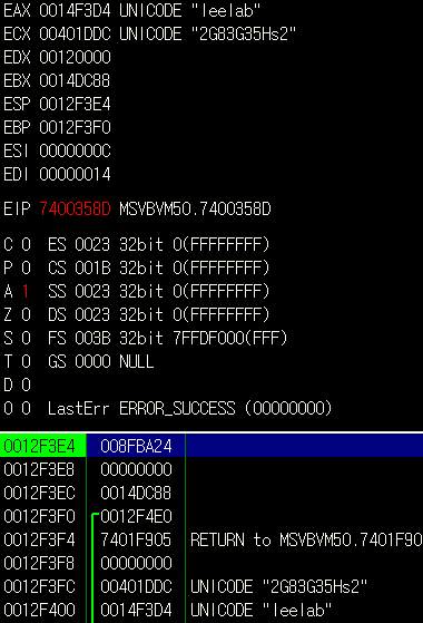 **의문점은 MOV EDI, DWORD PTR DS:[ECX-4]하면 leelab이 EDI에 들어간다는 점..