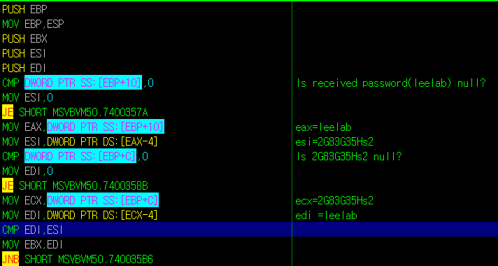 표시한 CMP 부분이 올바른 비밀번호(2G83G35Hs2)와 입력한 비밀번호(leelab)을 비교하는 부분이다.