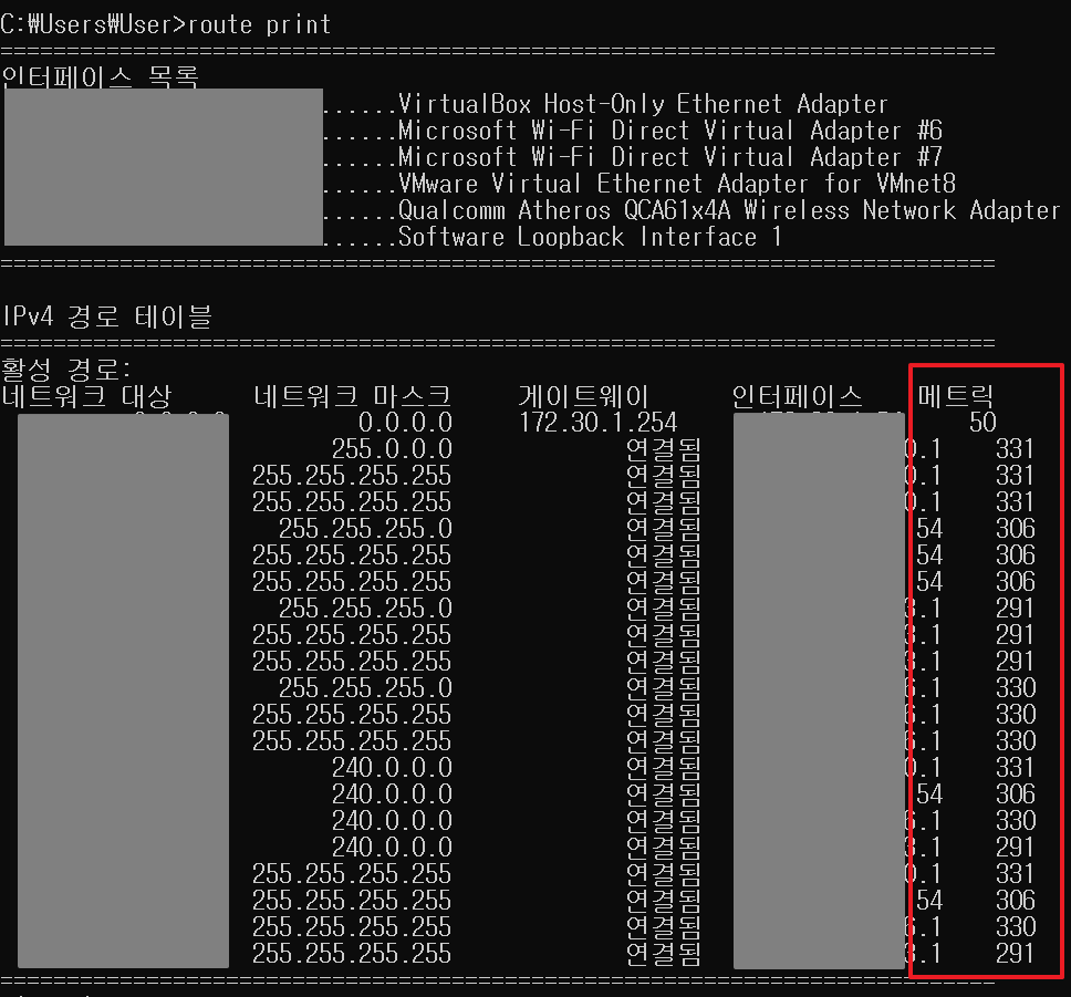 특정 네트워크 인터페이스에 할당되는 값으로, 해당 경로에 사용되는 비용을 확인하기 위해 사용된다.