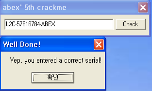 입력값과 L2C-57816784-ABEX와 같으면 성공일 거라고 유추한다.