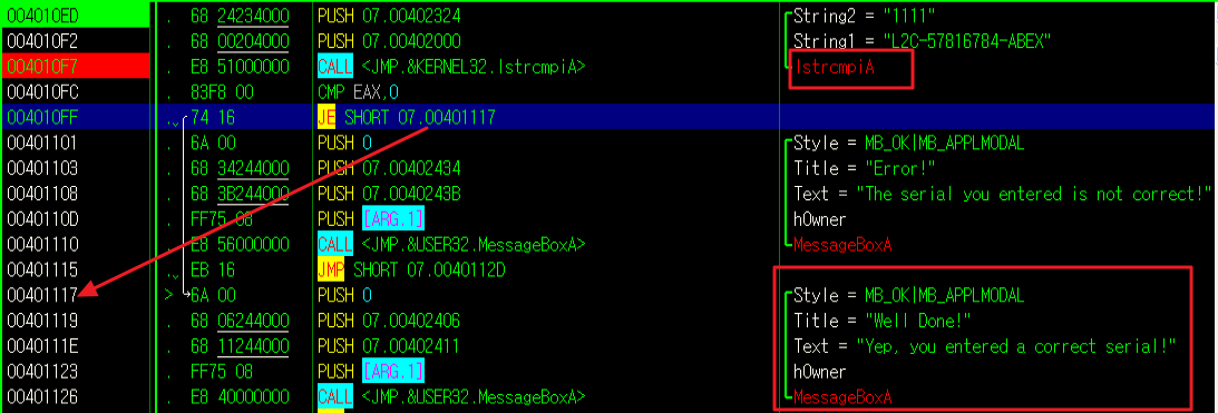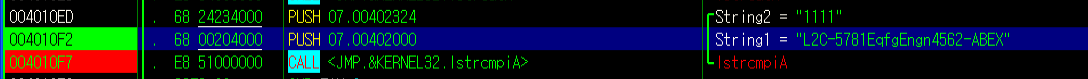 3. F8로 계속 내려오다 보면 lstrcmpiA 함수가 있다.