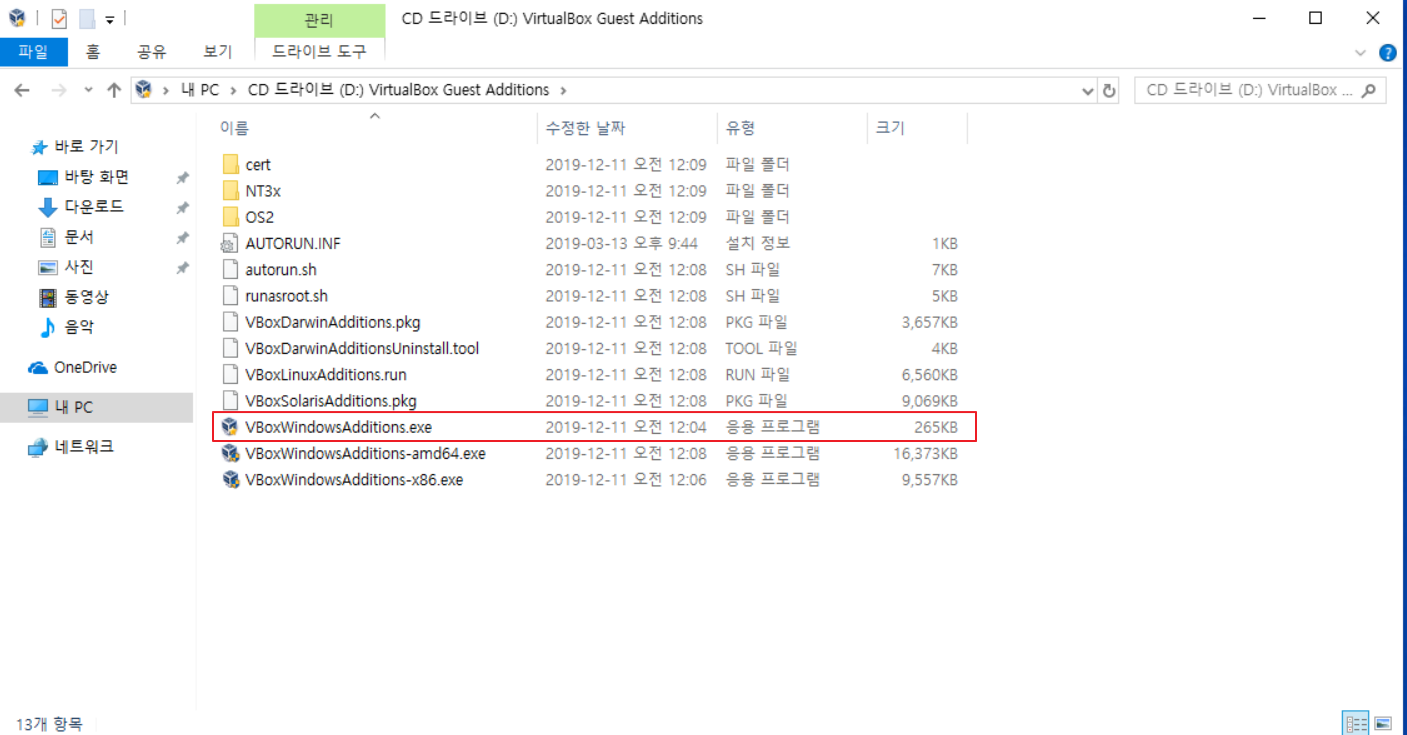 2. 내PC에서 새로 마운트 된 "VirtualBox Guest Additions" 드라이브 더블클릭