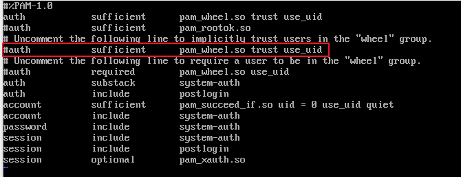 - 추가로 wheel 그룹이 su 명령 사용 시 패스워드 없이 로그인 할 수 있도록 하려면 trust 추가하면 된다.