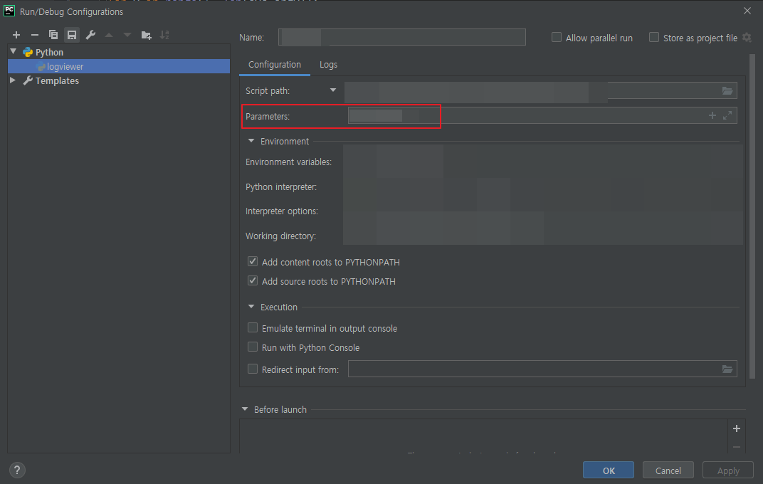 Pycharm에서 매개변수 설정하기