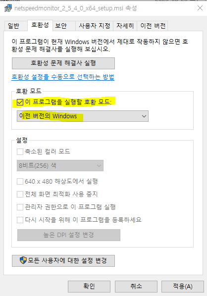 2) 설치 파일 우클릭 > 속성 > 호환성