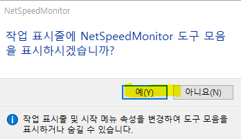 4) 설치 종료 후 "작업 표시줄에 NetSpeedMonitor 도구 모음을 표시하시겠습니까?"에 예를 클릭한다.